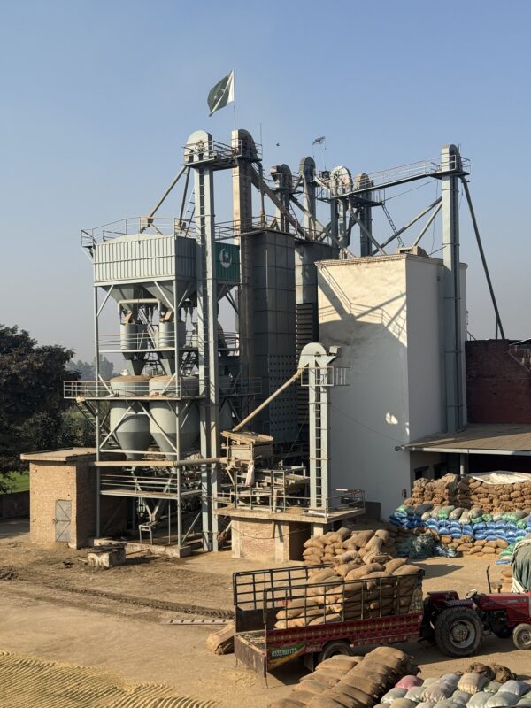 Rice processing plant with machinery and Pakistani flag, representing rice production and global export industry